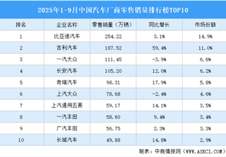 中商情报网讯:2025年1-9月,汽车零售销量前十厂商零售销量合计105.98万辆,市场份额合计62.2%。比亚迪汽车零售销量最高达254.22...[详细]