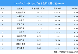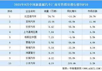 中商情报网讯:2025年9月,中国新能源汽车零售销量前十厂商零售销量合计98.24万辆,市场份额75.6%。比亚迪汽车零售销量最高达34....[详细]