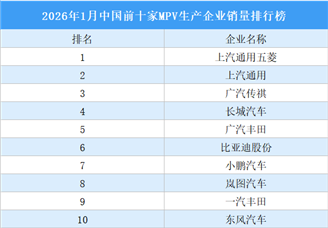 中商情报网讯:2026年1月,销量排名前十位的MPV生产企业共销售6.3万辆,占MPV销售总量的85.4%。其中,上汽通用五菱销量最高,上...[详细]