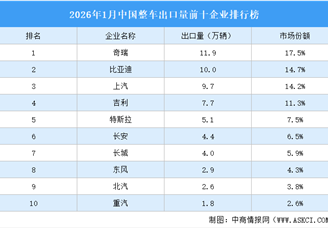 中商情报网讯:2026年1月,销量排名前十位的SUV生产企业共销售73.4万辆,占SUV销售总量的63.9%。其中,奇瑞汽车销量逼近20万辆位...[详细]