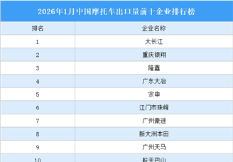 中商情报网讯:2026年1月,摩托车出口132.3万辆,环比增长6.86%,同比增长24.94%。摩托车出口量排名前十位的企业依次为:大长江...[详细]