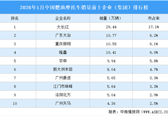 中商情报网讯:2026年1月,汽车销量排名前十位的企业(集团)共销售196.2万辆,占汽车销售总量的83.6%。其中,上汽集团销量最高...[详细]