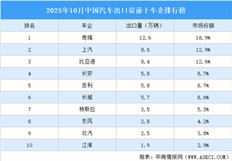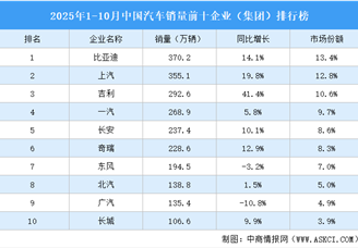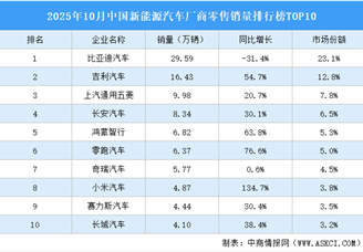 中商情报网讯:2025年10月,汽车零售销量前十厂商零售销量合计138.05万辆,市场份额合计61.4%。比亚迪汽车零售销量最高达29.59万...[详细]