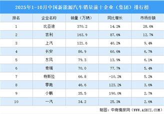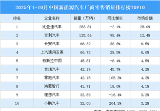 中商情报网讯:2025年10月,新能源汽车零售销量前十厂商批发销量合计120.74万辆,市场份额合计74.5%。比亚迪汽车零售销量最高达4...[详细]