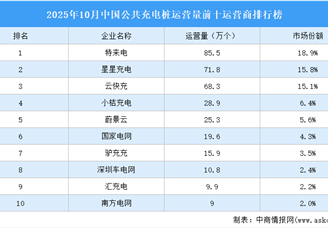 中商情报网讯:截至2025年10月底,我国电动汽车公共充电设施(枪)453.3万个,同比增长39.5%。TOP10企业公共充电桩运营量合计345...[详细]