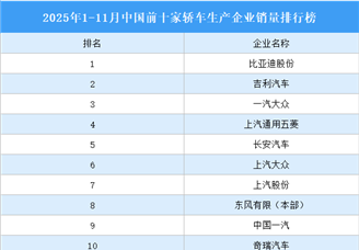 中商情报网讯:2025年1-11月,销量排名前十位的轿车生产企业共销售782.6万辆,占轿车销售总量的69.3%。其中,比亚迪股份销量最高...[详细]