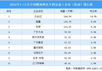 中商情报网讯:1-11月,全行业完成燃油摩托车销量1682.35万辆,同比增长7.43%。TOP3企业燃油摩托车销量市占率29.3%,TOP5企业燃...[详细]