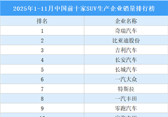 中商情报网讯:2025年1-11月,销量排名前十位的SUV生产企业共销售958.3万辆,占SUV销售总量的65.9%。奇瑞汽车销量最高超200万辆...[详细]