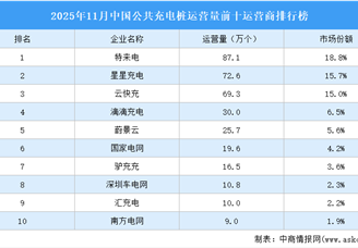 中商情报网讯:截至2025年11月底,我国公共充电设施(枪)462.5万个,同比增长36.0%。TOP10企业公共充电桩运营量350.6万个,市场...[详细]