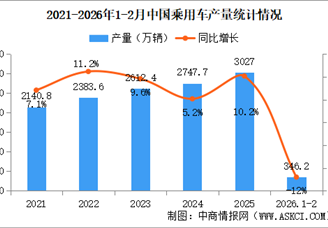 中商情报网讯:2026年2月,乘用车产销分别完成140万辆和153.6万辆,环比分别下降32.1%和22.7%,同比分别下降21.6%和15.4%。2026...