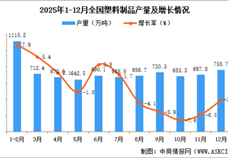 中商情报网讯:据中商产业研究院数据库,2025年12月全国塑料制品当月产量与去年同期相比下降。2025年12月全国塑料制品产量为758....
