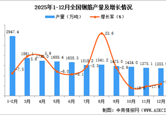 中商情报网讯:据中商产业研究院数据库,2025年12月全国钢筋当月产量与去年同期相比下降。2025年12月全国钢筋产量为1355.9万吨,...