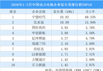 中商情报网讯:1月,国内动力电池装车量42.0GWh,环比下降57.2%,同比增长8.4%。TOP10企业动力电池装车量合计40.22GWh,市占率合...[详细]