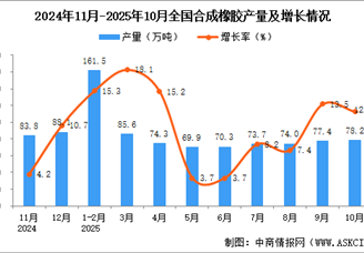 中商情报网讯:据中商产业研究院数据库,2025年10月全国合成橡胶当月产量与去年同期相比增长。2025年10月全国合成橡胶产量为78.2...