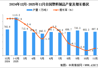中商情报网讯:据中商产业研究院数据库,2025年11月全国塑料制品当月产量与去年同期相比下降。2025年11月全国塑料制品产量为697....[详细]