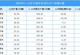 中商情报网讯:据中商产业研究院数据库,2025年12月全国汽车当月产量与去年同期相比下降。2025年12月全国汽车产量为341.2万辆,...