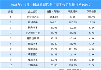2025年1-9月中国新能源汽车厂商零售销量排行榜TOP10(附榜单)