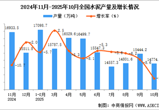 中商情报网讯:据中商产业研究院数据库,2025年10月全国水泥当月产量与去年同期相比下降。2025年10月全国水泥产量为14774.8万吨...