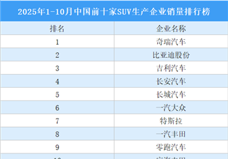 2025年1-10月中国前十家SUV生产企业销量排行榜(图)
