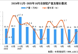 中商情报网讯:据中商产业研究院数据库,2025年10月全国铅当月产量与去年同期相比下降。2025年10月全国铅产量为64.5万吨,同比下...[详细]