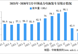 2026年2月中国动力电池装机量情况:磷酸铁锂电池装车量同比下降27.5%(图)