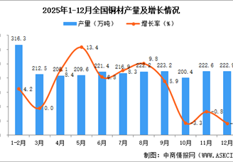 中商情报网讯:据中商产业研究院数据库,2025年12月全国铜材当月产量与去年同期相比下降。2025年12月全国铜材产量为222.9万吨,...