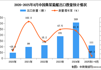 中商情报网讯:据中商产业研究院数据库显示,2024年中国集装箱船出口量309艘,同比增长61.8%。最新数据显示,2025年1-8月中国集...