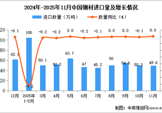 中商情报网讯:据中商产业研究院数据库显示,2025年11月中国钢材进口量49.6万吨,同比增长持平;1-11月中国钢材进口量554.1万吨...