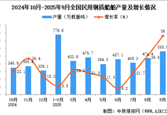 中商情报网讯:据中商产业研究院数据库,2025年9月全国民用钢质船舶当月产量与去年同期相比增长。2025年9月全国民用钢质船舶产量...