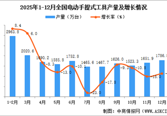 中商情报网讯:据中商产业研究院数据库,2025年12月全国电动手提式工具当月产量与去年同期相比下降。2025年12月全国电动手提式工...