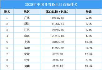 中商情报网讯:海关总署数据显示,2025年中国货物贸易出口26.99万亿元,同比增长6.1%,出口向新向优趋势明显。 从各省份出口排名...[详细]