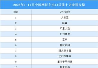 中商情报网讯:1-11月,摩托车整车出口量1208.23万辆,同比增长21.27%,1-11月,摩托车出口量排名前十位的企业依次为:大长江、...[详细]