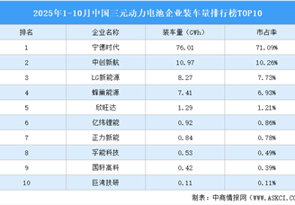 2025年1-10月中国三元动力电池企业装车量排行榜TOP10(附榜单)