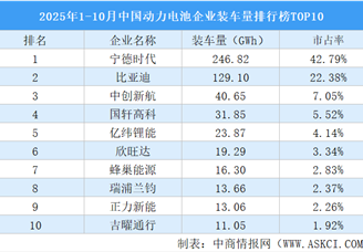 2025年1-10月中国动力电池企业装车量排行榜TOP10(附榜单)