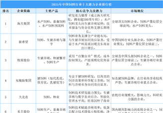 中商情报网讯:2025年中国饲料行业十大潜力企业分别为:海大集团、新希望、牧原股份、双胞胎集团、大北农、禾丰股份、通威股份、...[详细]