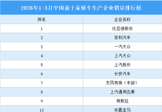 中商情报网讯:2026年1-3月,销量排名前十位的轿车生产企业共销售146.5万辆,占轿车销售总量的68.7%。其中,比亚迪股份销量最高...[详细]